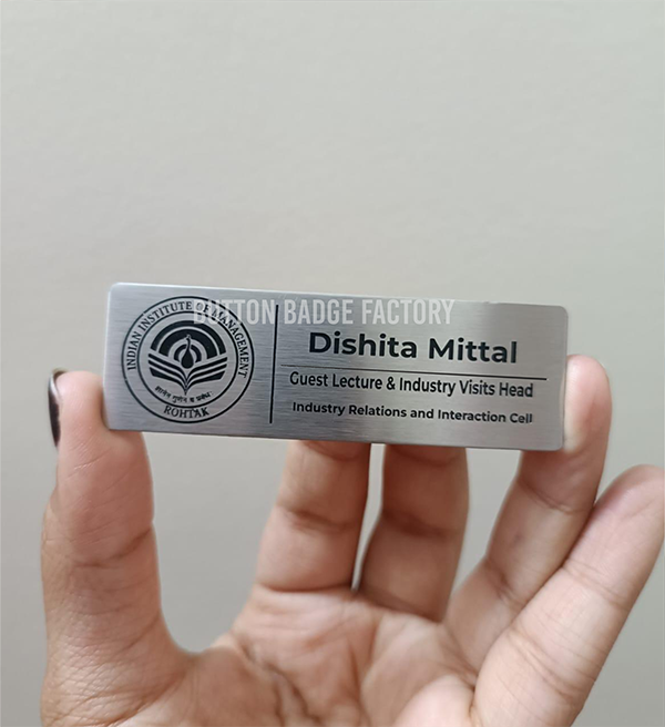 Metal Engraved rectangular name badges for schools, colleges and offices in silver & golden.